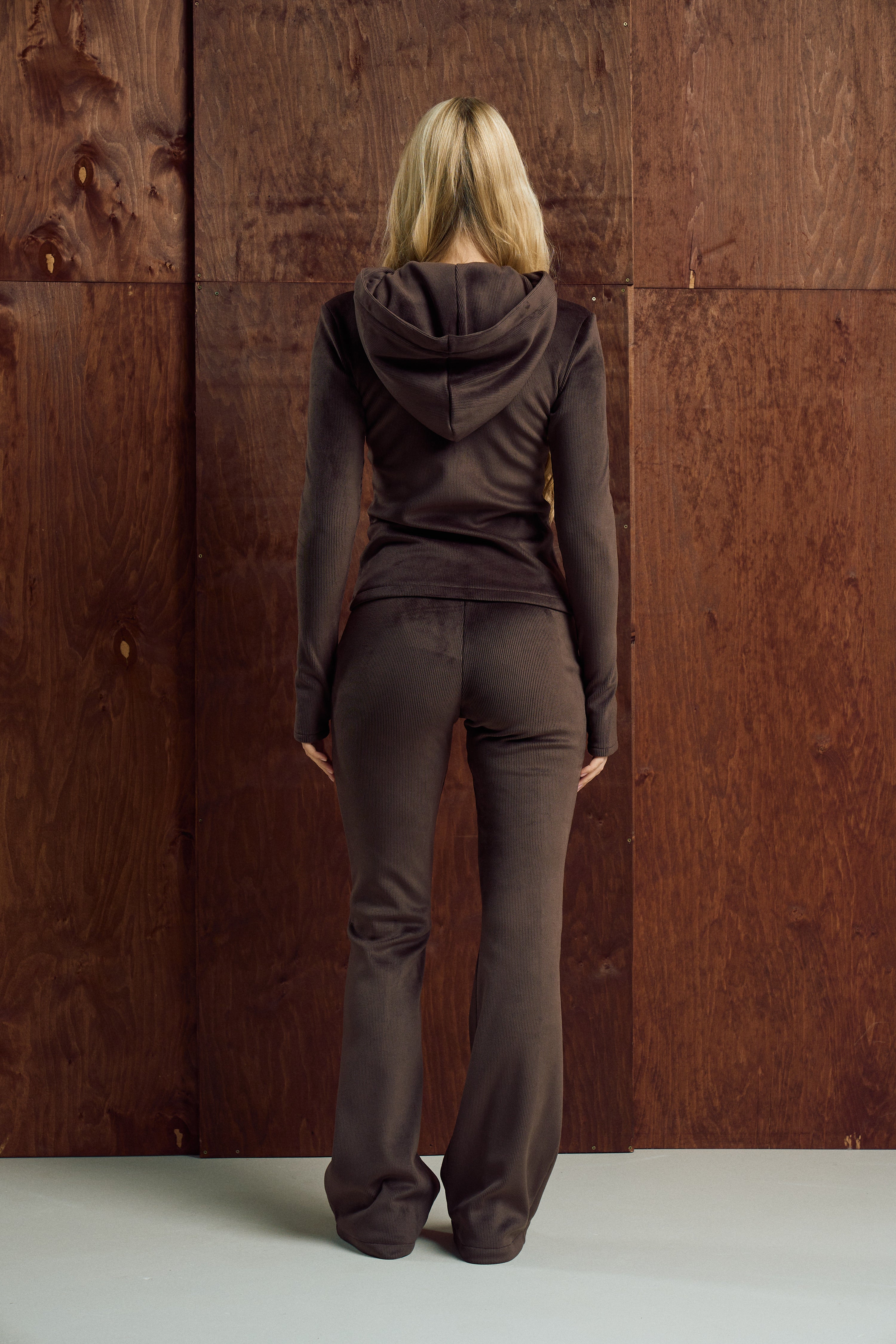 Цей костюм ідеально сідає по фігурі, підкреслюючи всі вигини тіла. Верх із м’якої, еластичної тканини щільно прилягає до тіла, а штани з розкльошеними штанинами додають образу легкості та модного настрою. Сучасна класика, яка пасує як для вечірнього виходу, так і для стильного повсякденного луку.