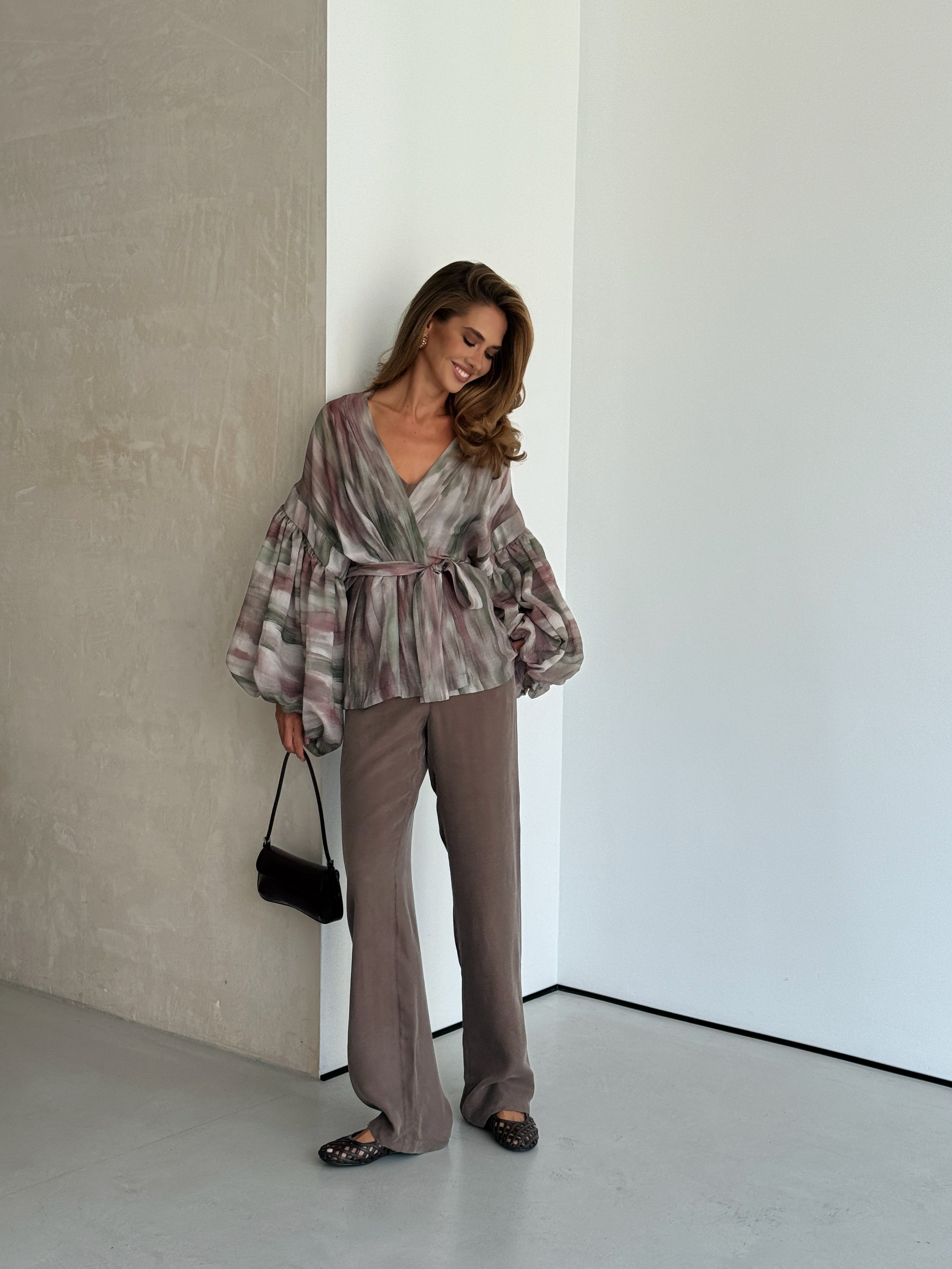 Шифонова сорочка в стилі кімоно — це легкість, свобода рухів і вишуканий мінімалізм. Повітряний шифон красиво спадає, створюючи ніжний, плавний силует, а вільний крій із характерними рукавами кімоно додає нотки східної естетики та елегантності.