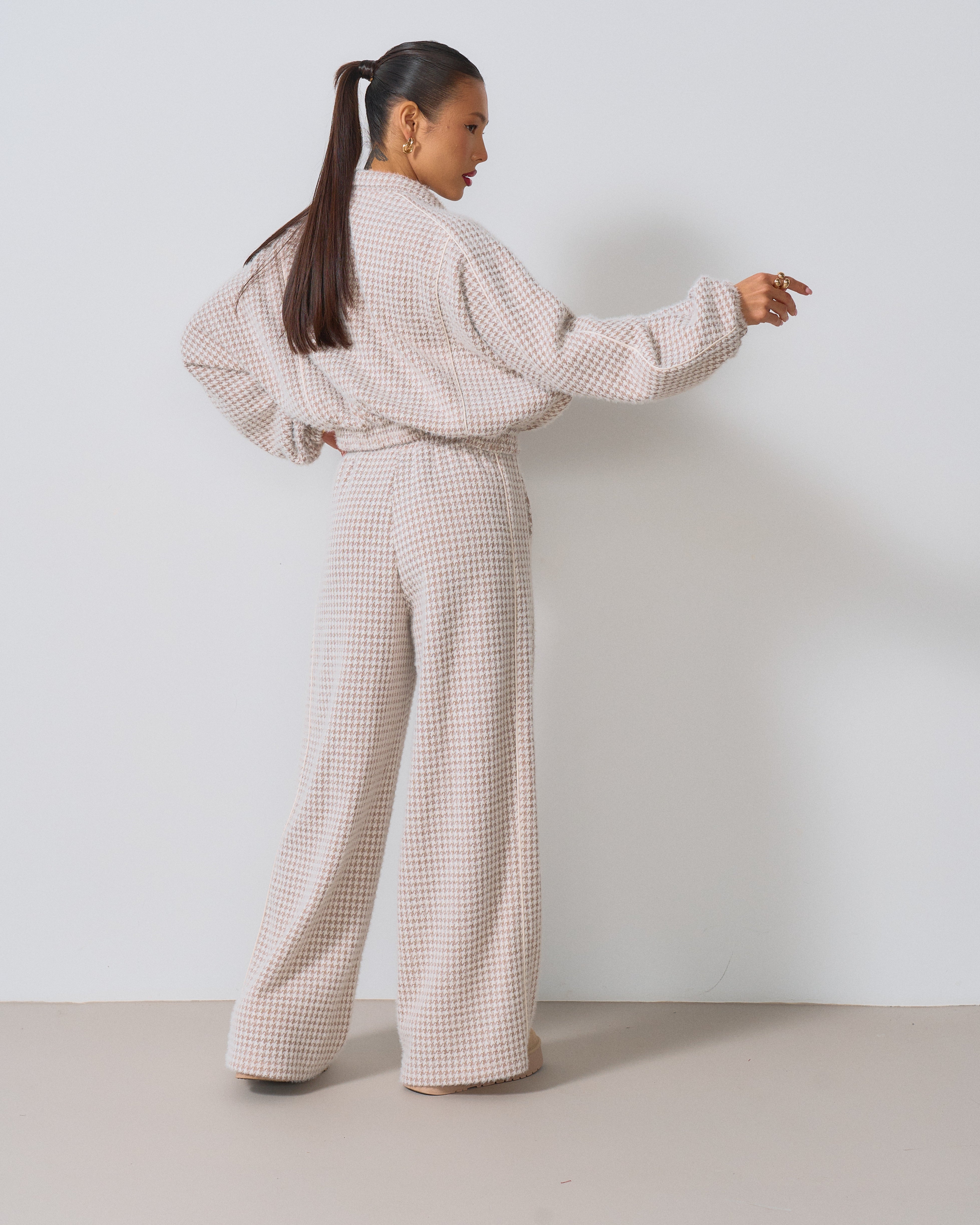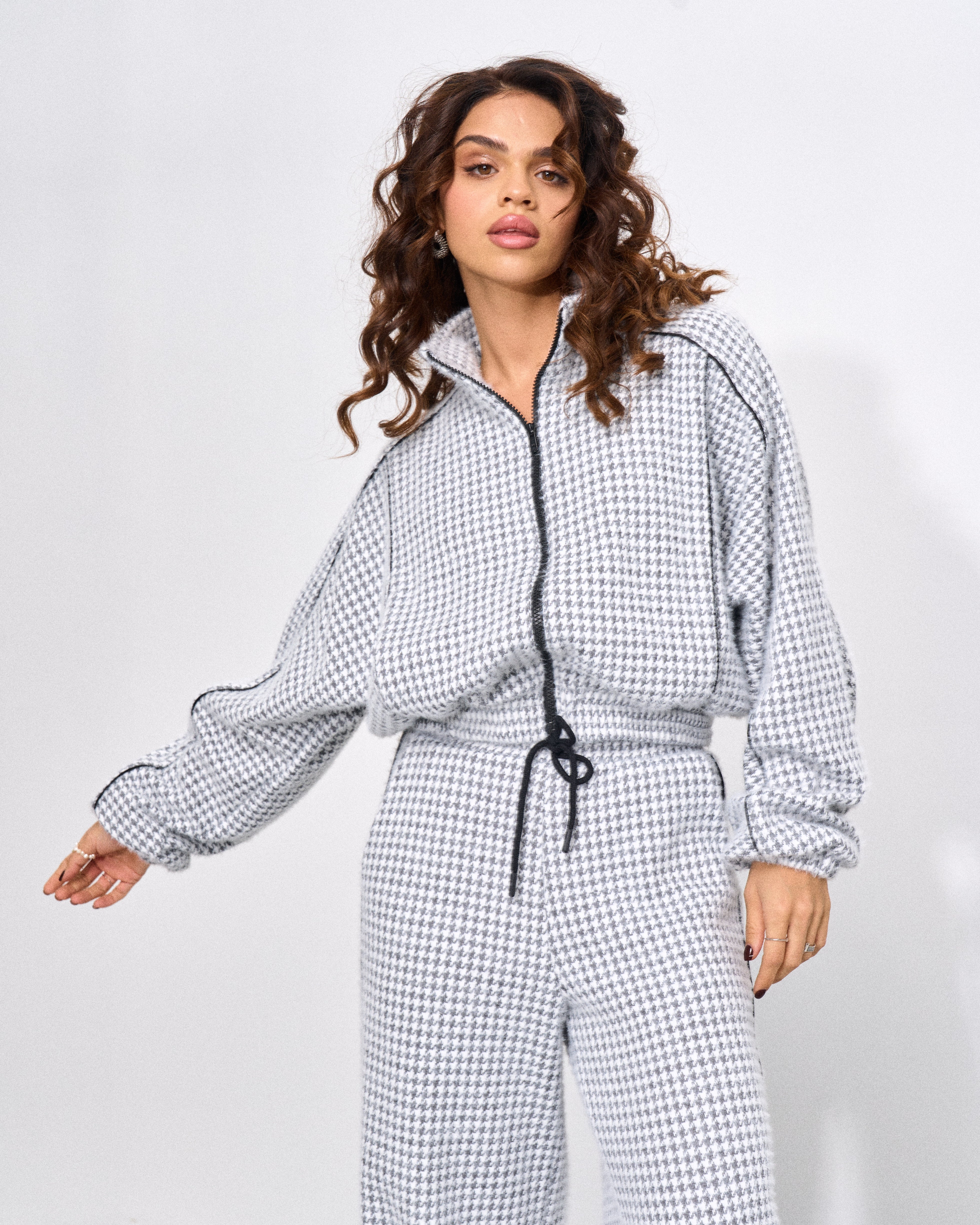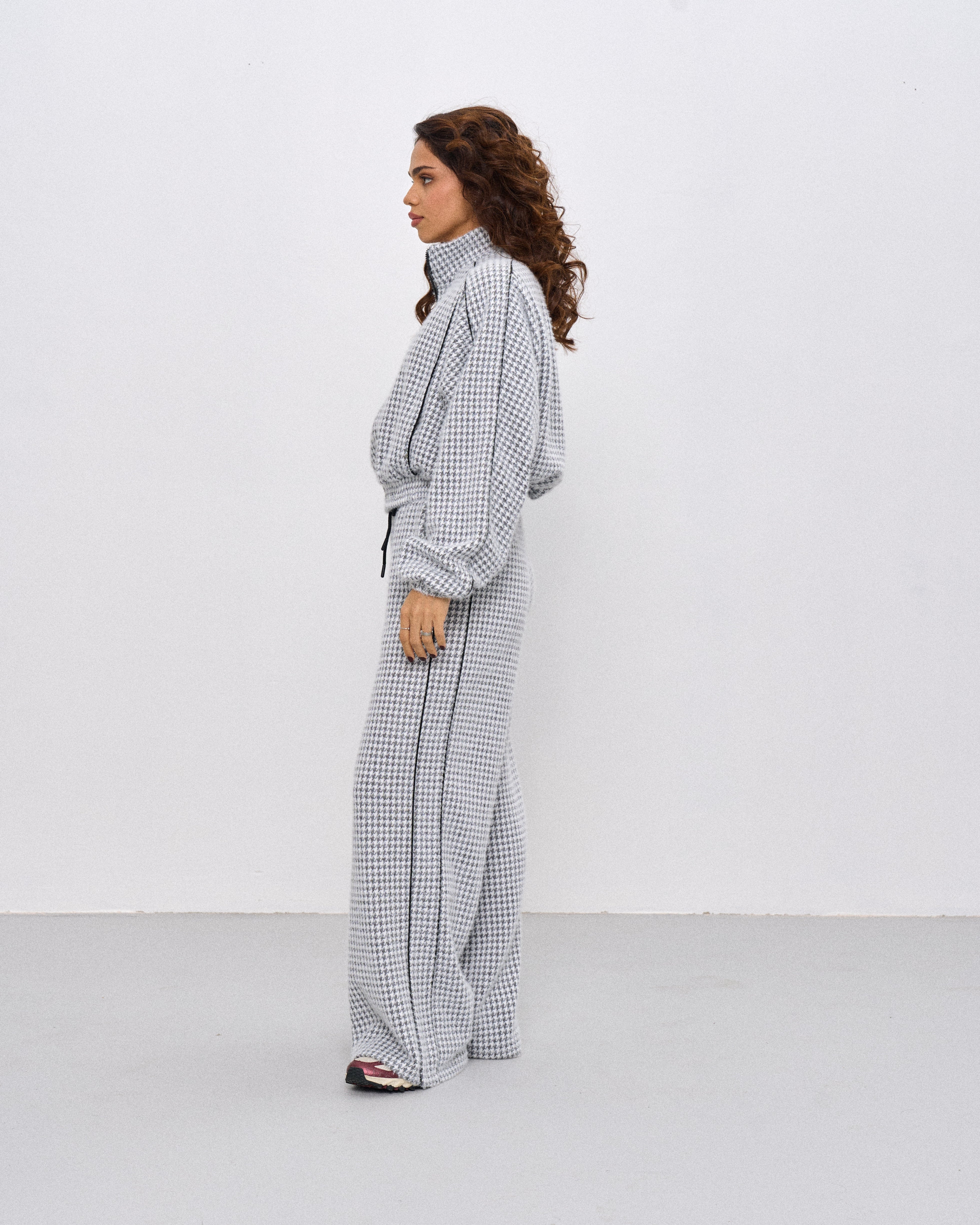 Цей костюм — ідеальне поєднання вишуканості та актуального дизайну. Виготовлений з якісної тканини з візерунком «гусина лапка», він додає образу неповторного шарму та елегантності. Такий принт завжди на піку моди і підкреслює індивідуальність.