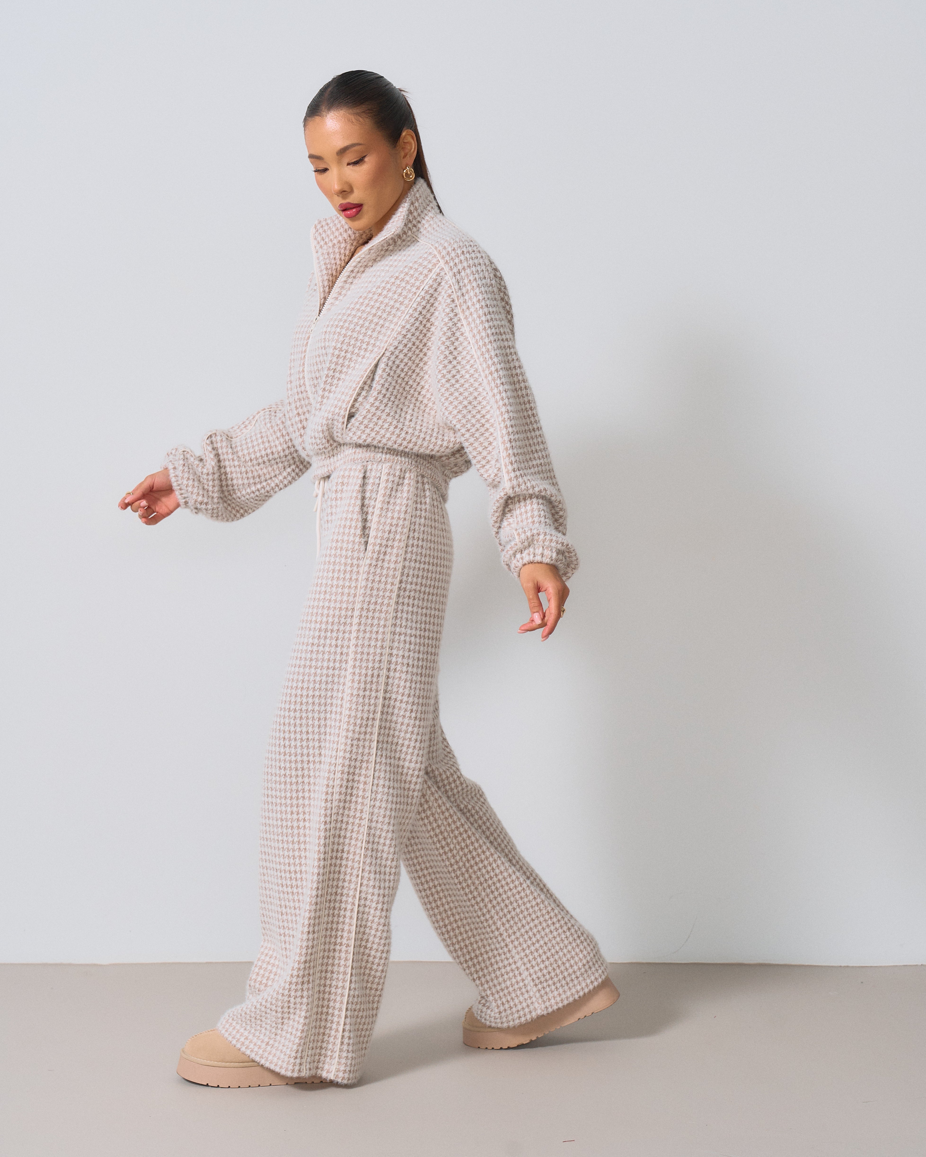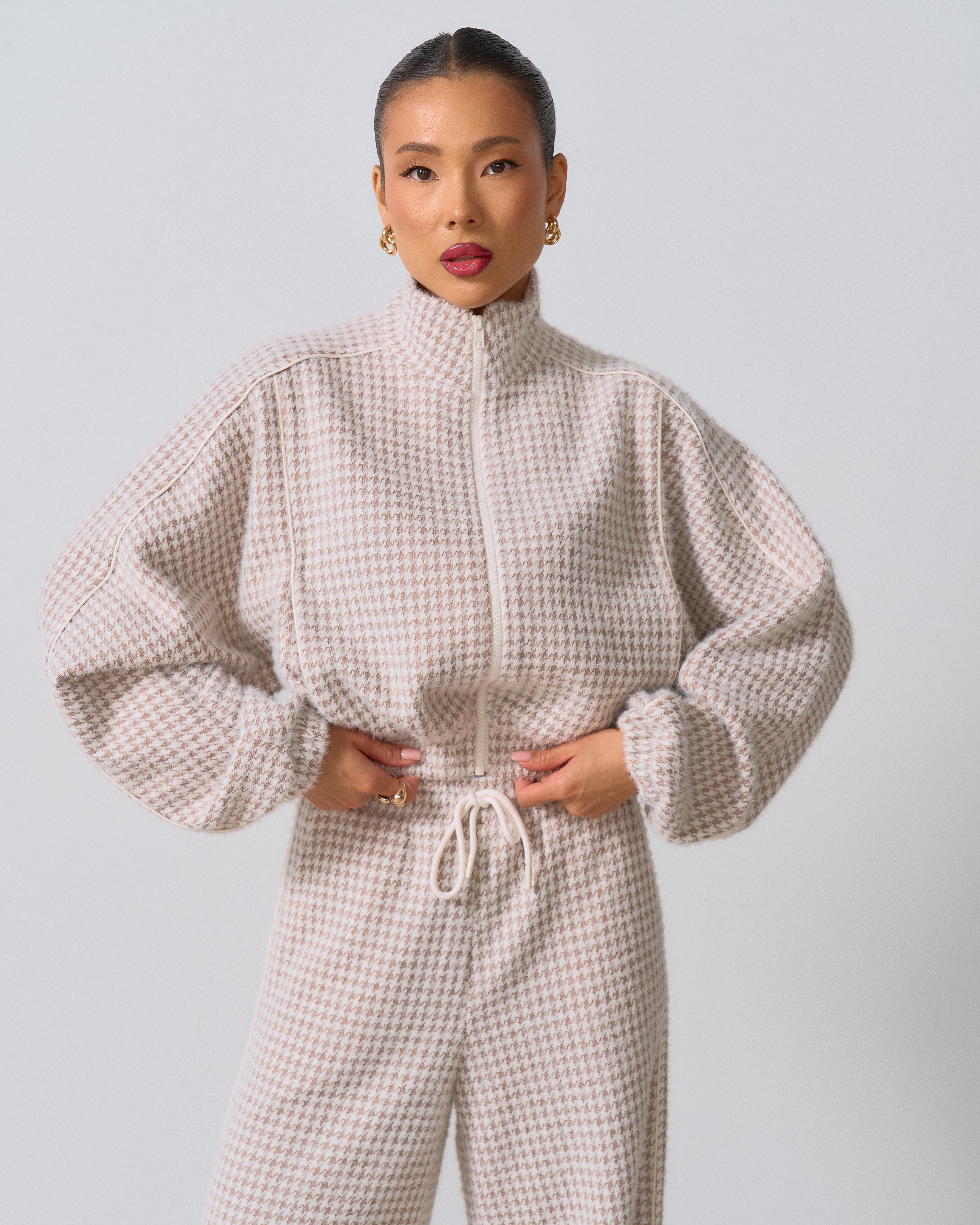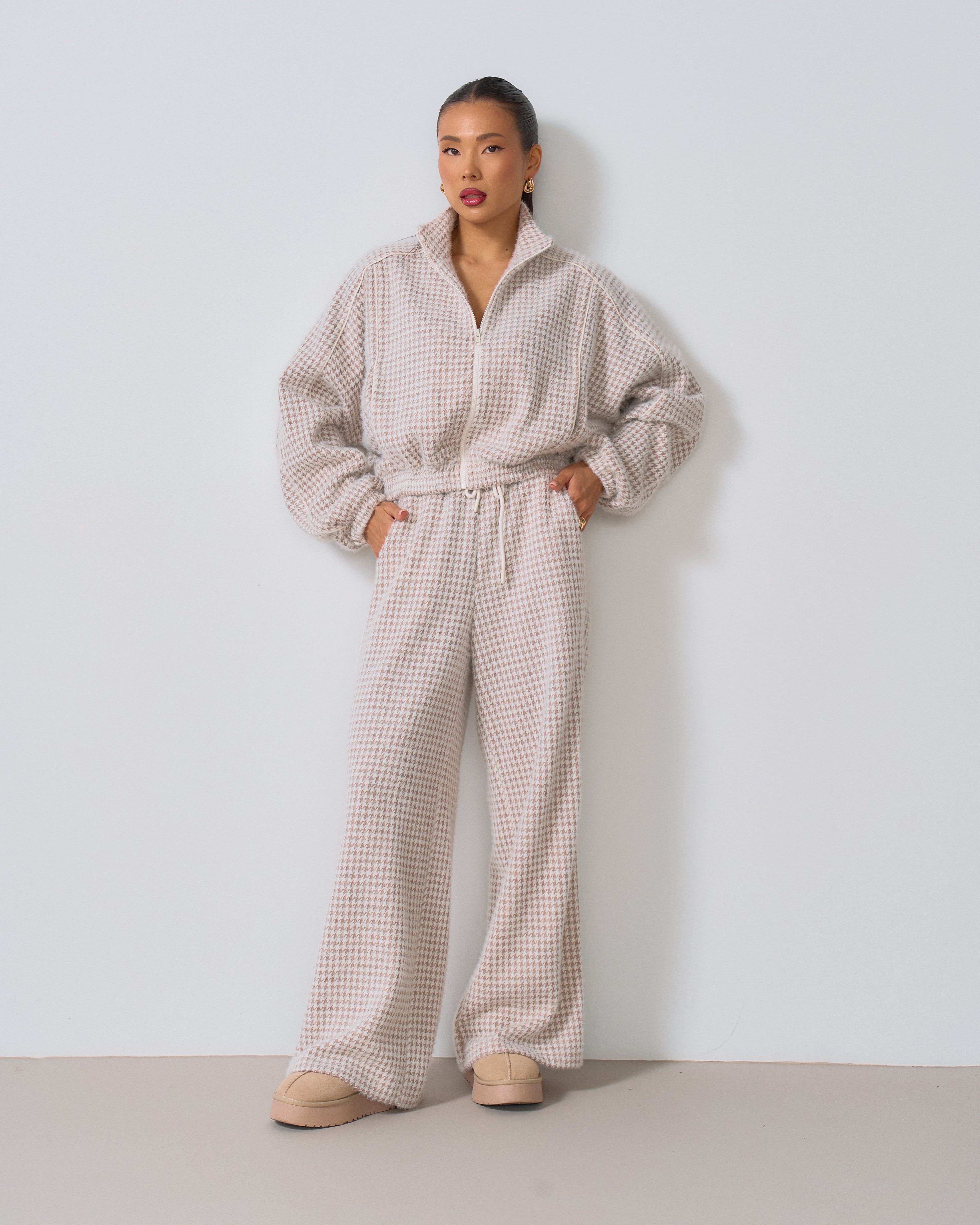 Цей костюм — ідеальне поєднання вишуканості та актуального дизайну. Виготовлений з якісної тканини з візерунком «гусина лапка», він додає образу неповторного шарму та елегантності. Такий принт завжди на піку моди і підкреслює індивідуальність.