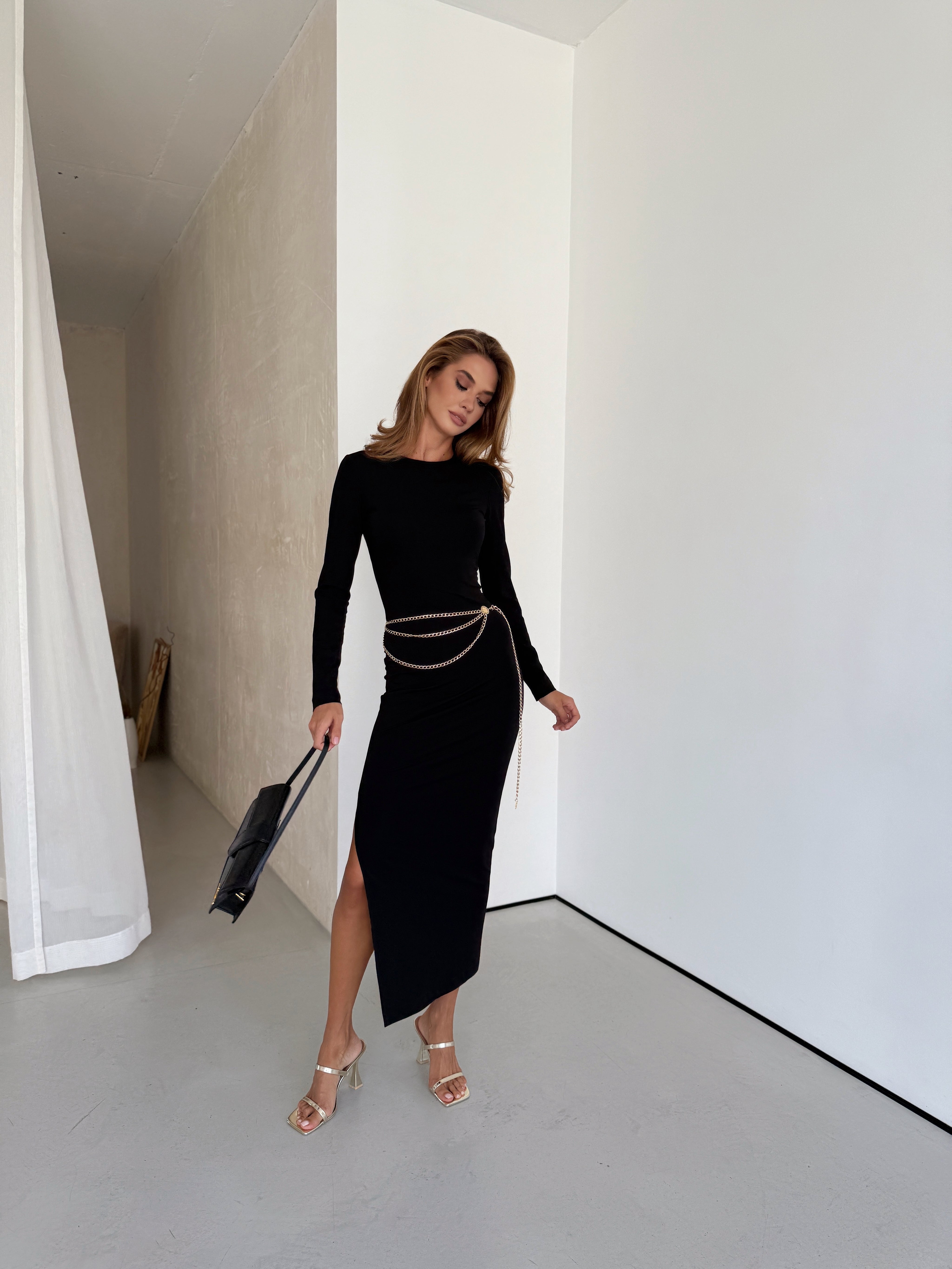 Елегантна чорна сукня з акцентом на жіночність та стиль. Виконана з приємного щільного трикотажу, який ідеально тримає форму та не просвічується. Асиметричний розріз додає образу витонченості, а пояс-ланцюжок у комплекті підкреслює талію та створює трендовий акцент.