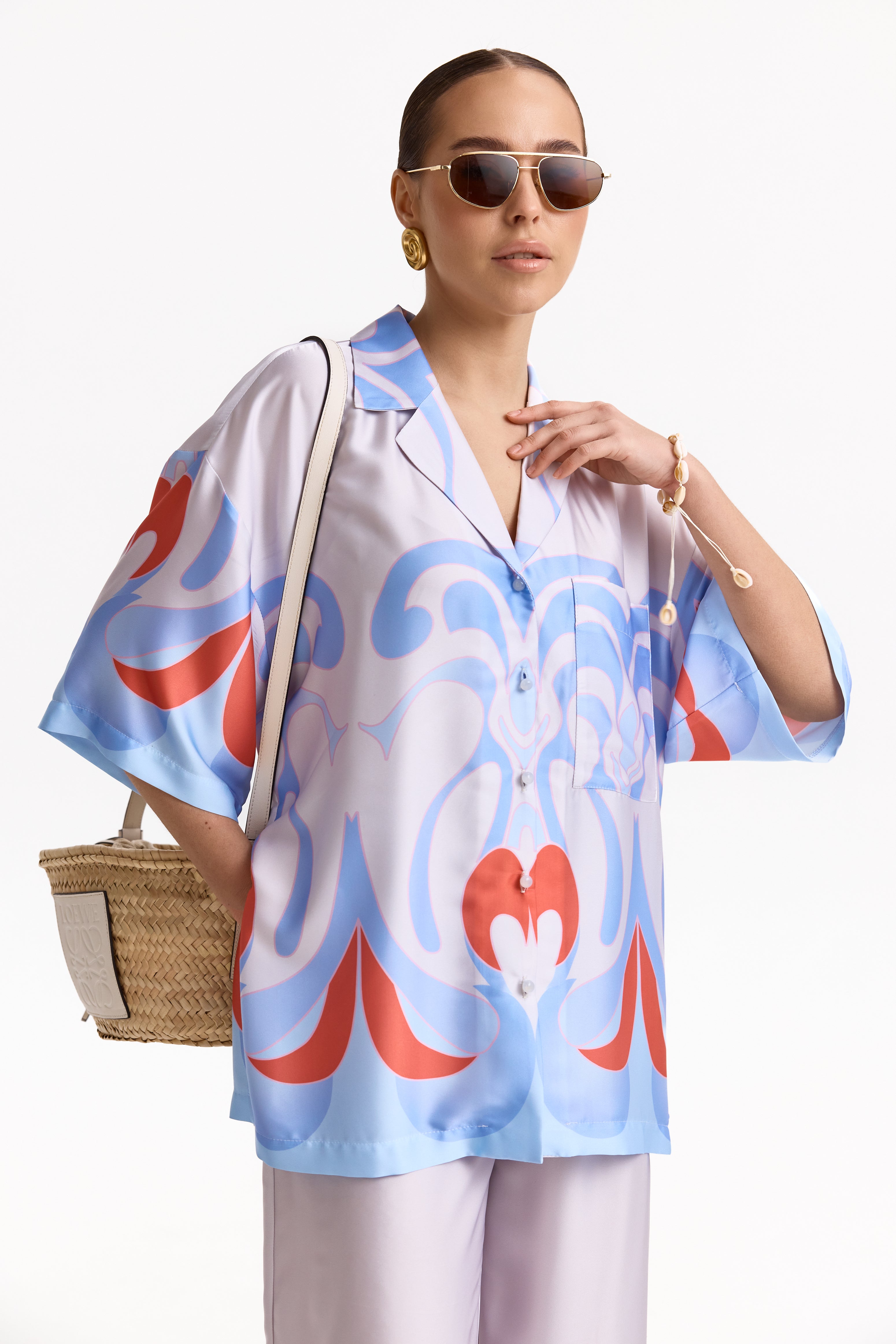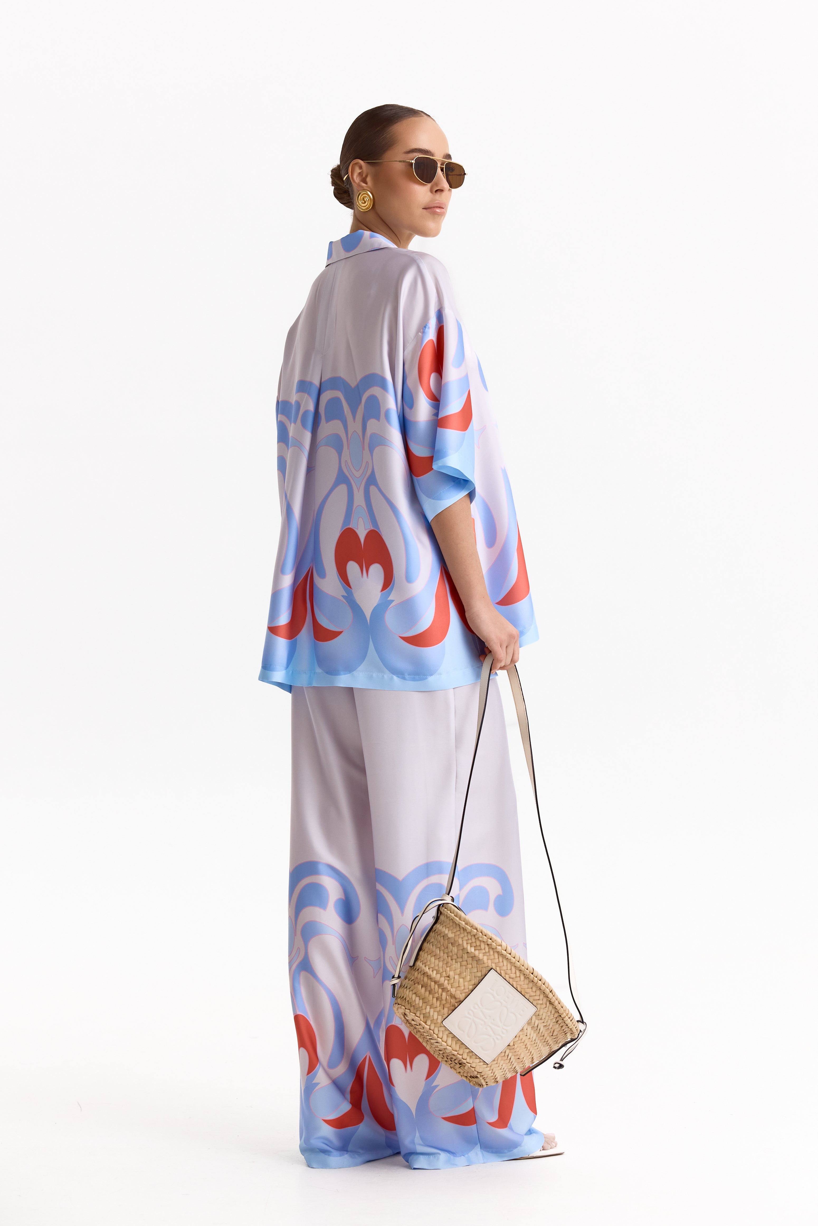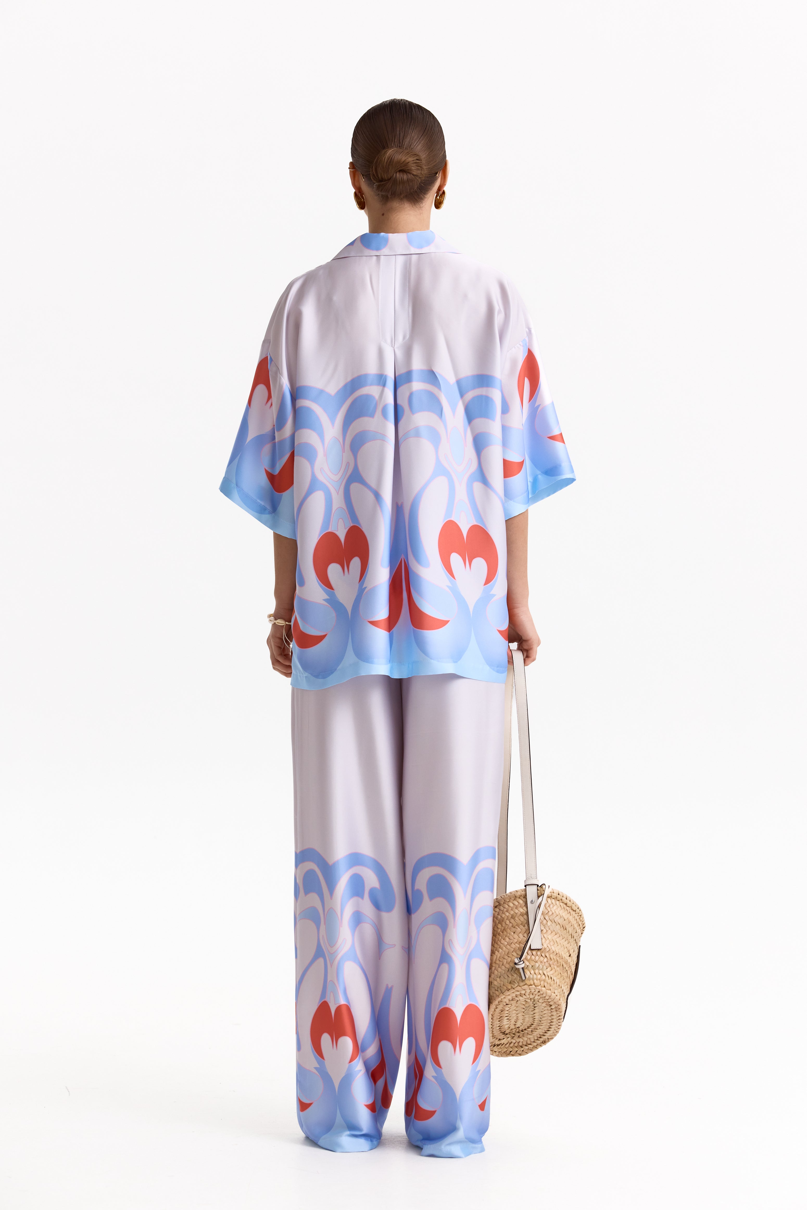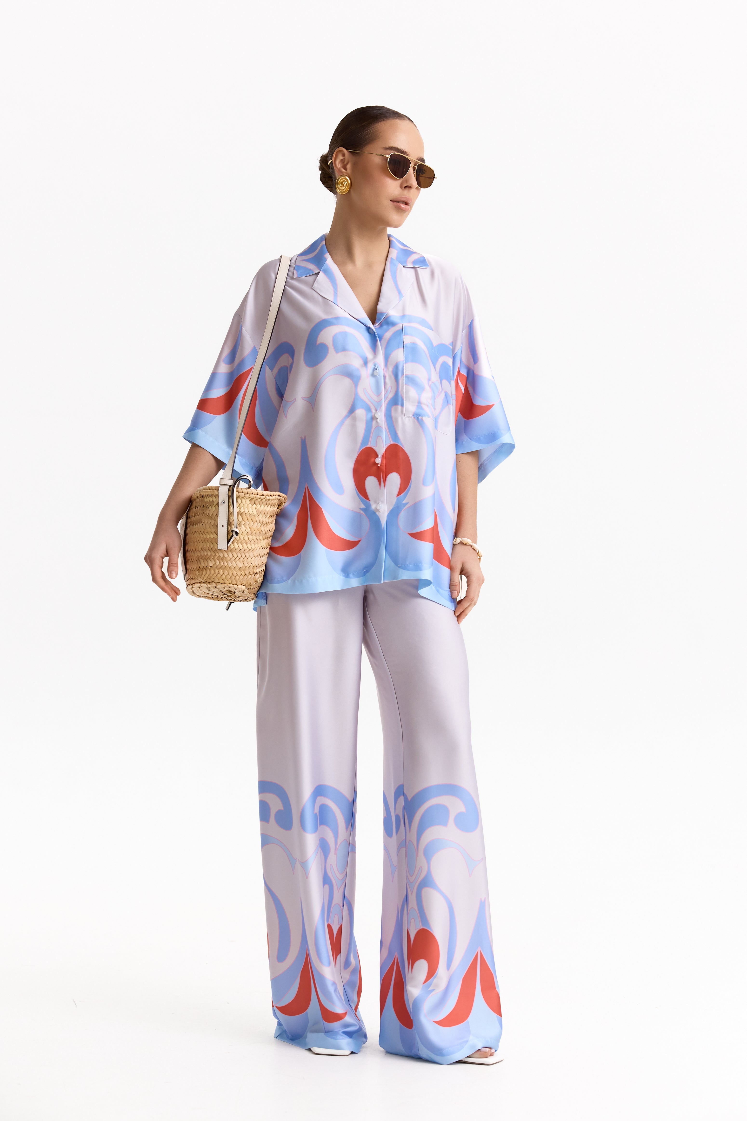 Головний акцент — авторський орнамент у відтінках небесно-блакитного та коралового, що надає комплекту характеру й впізнаваності. М’яка, струмлива тканина делікатно переливається при русі, підкреслюючи преміальність виробу та комфорт у носінні.