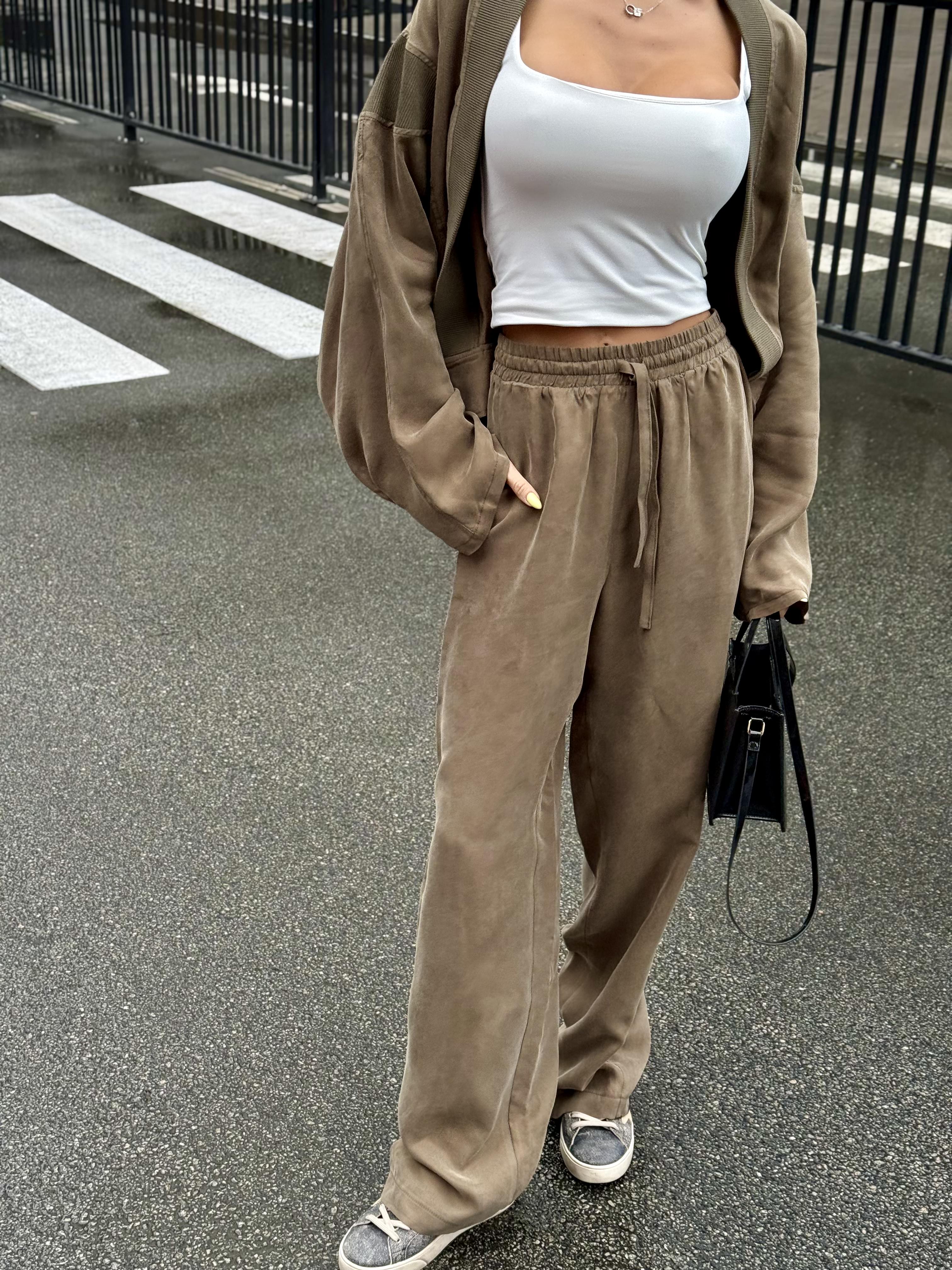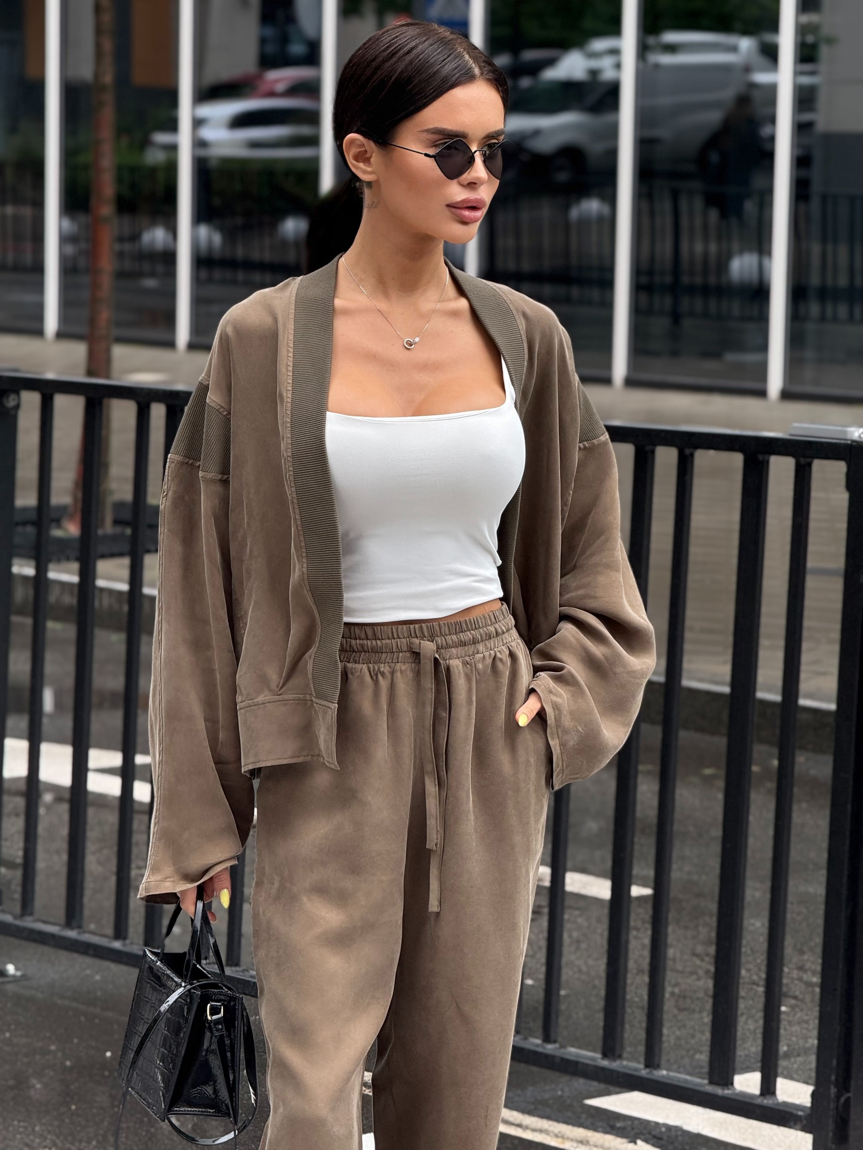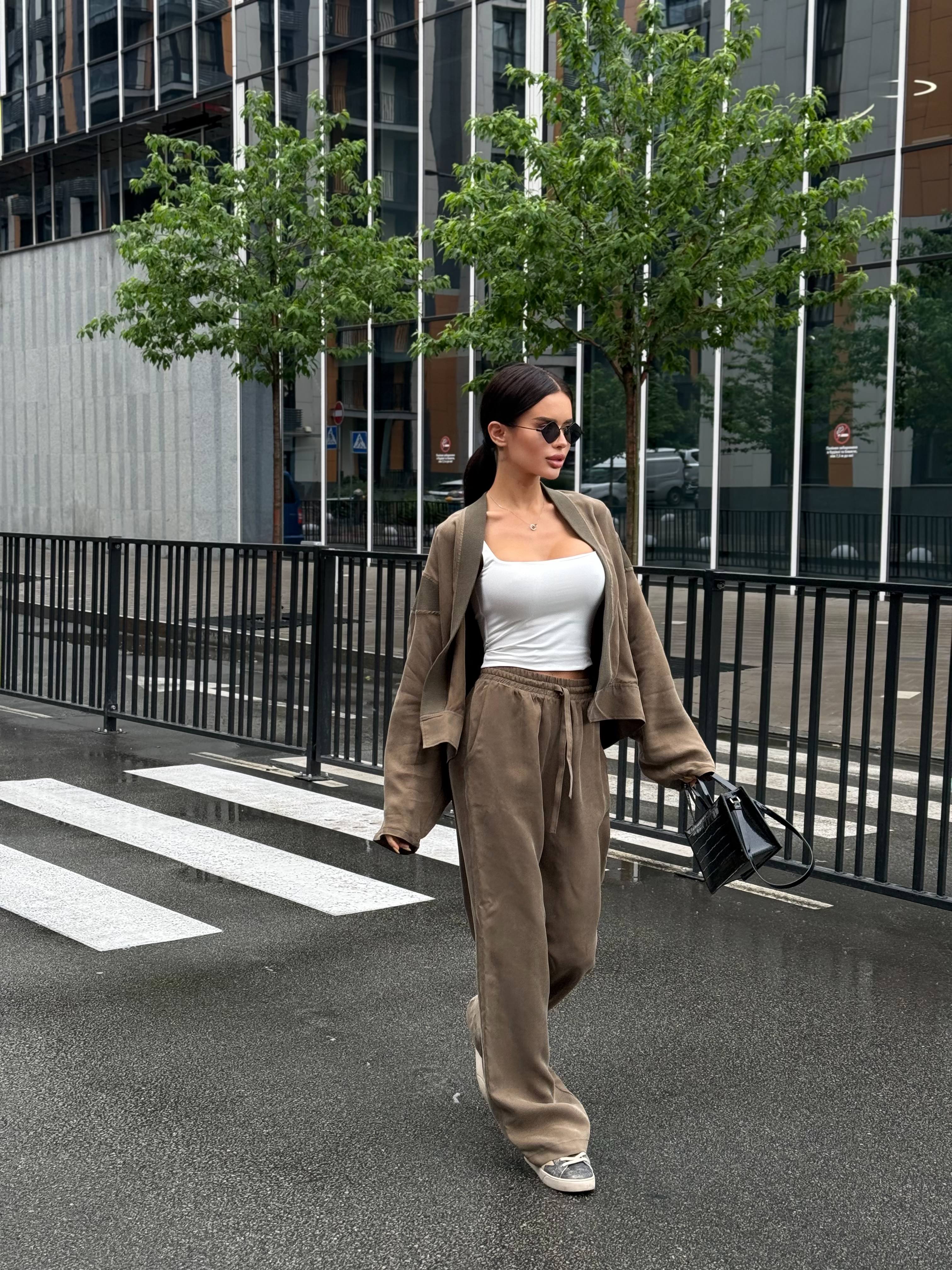 Костюм із мокрого шовку — втілення розкоші та витонченості. Легка, блискуча тканина м’яко лягає по тілу, створюючи ефект текучості й ніжності в кожному русі. Натуральний шовк із характерним "вологим" блиском додає образу глибини та загадковості. Ідеальний для вечірніх виходів, особливих подій або просто тоді, коли хочеться відчути себе впевнено та неповторно. Цей костюм — коли комфорт і елегантність йдуть поруч.